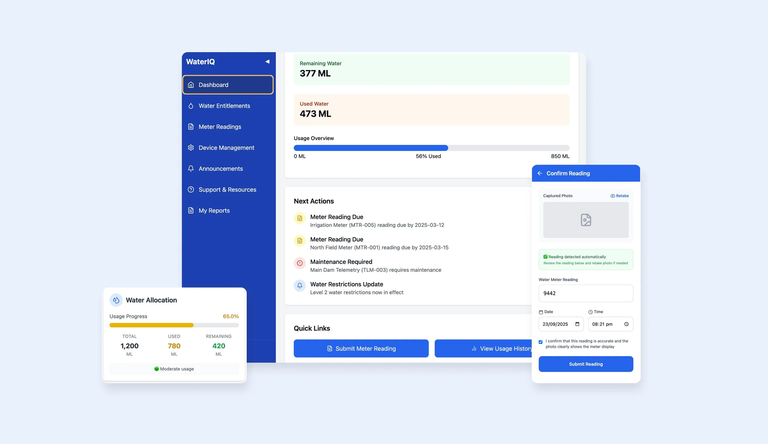 Delivering immediate value. We designed the new dashboard to answer users' key questions the moment they log in, empowering them with the insights needed for strategic planning while making core tasks like submitting a reading obvious. The companion mobile app extends this clarity into the field with core information and timely alerts.